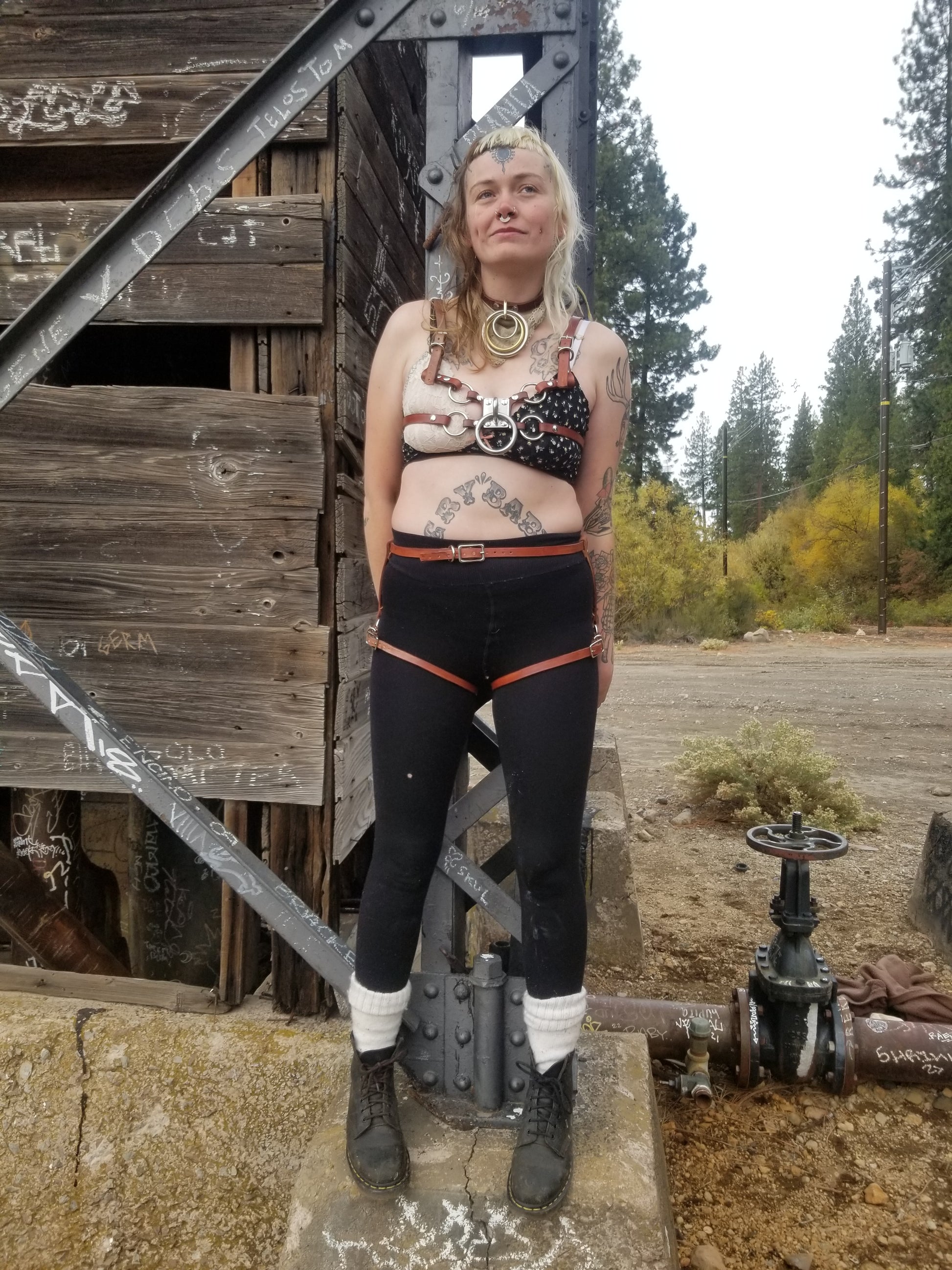 Short chest harness with heavy duty hardware xl o ring with plate. Adjustable shoulder straps and a buckle back. Leather in color of your choice. Compact harness that kicks ass. Few restraint points or wear with a person restrained to you.