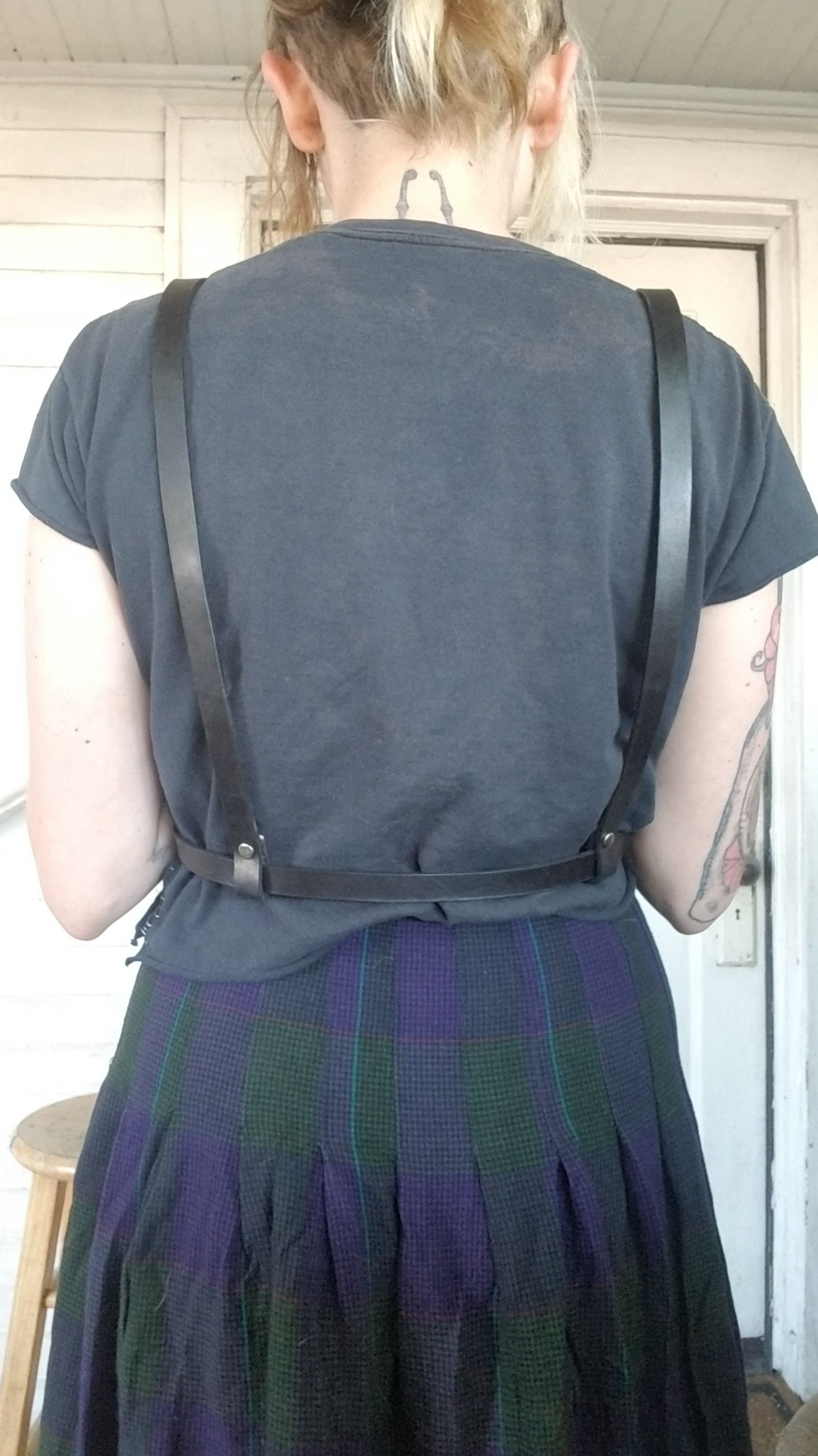 Vine harness is a top harness with two straps from the shoulders to the waist strap. The front has two buckles and crossing straps.